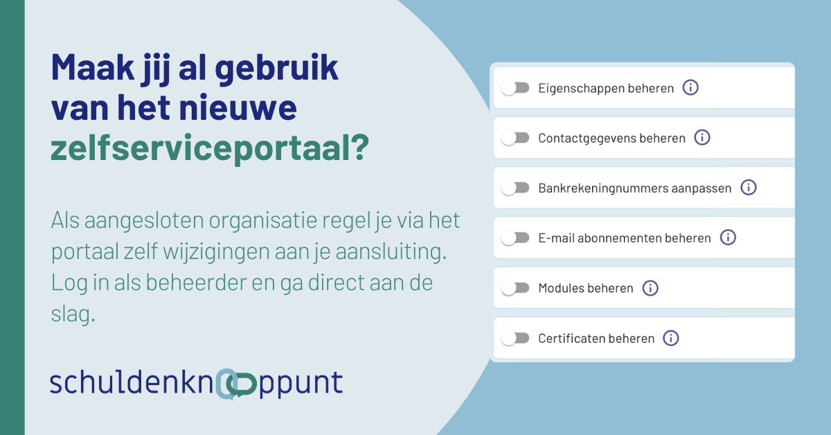 Deelnemers kunnen het Schuldenknooppunt dus op de vertrouwde manier blijven gebruiken. Ook de aansluiting verandert niet, want aanmelden loopt net als nu via het aansluitformulier op de website van het Schuldenknooppunt.