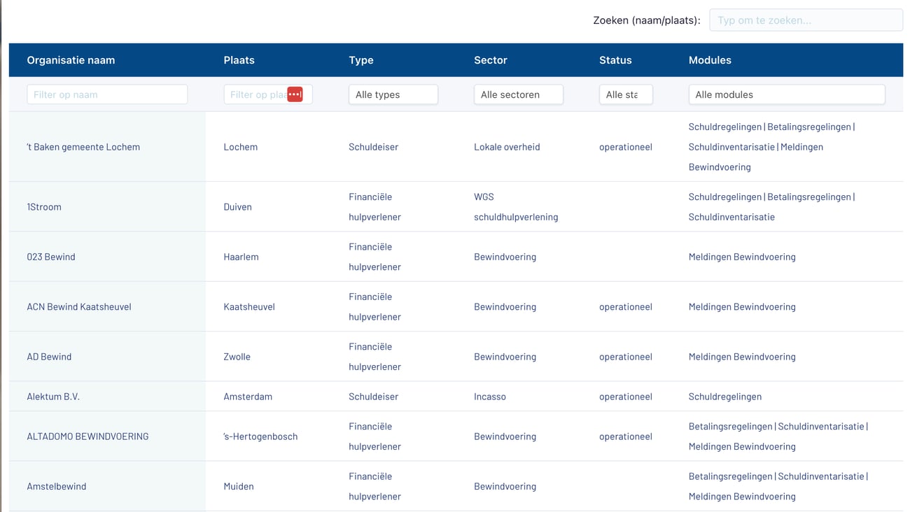 De deelnemerspagina van het Schuldenknooppunt is vernieuwd. Op basis van de input die we van onze deelnemers ontvingen, hebben we de pagina overzichtelijker gemaakt en een zoek- en filterfunctie toegevoegd. Zo zie je snel welke organisaties zijn aangesloten, welke modules zij gebruiken en in welke fase van aansluiting zij zitten. De informatie op de deelnemerspagina wordt vanaf nu maandelijks bijgewerkt. Neem een kijkje en laat ons weten wat je ervan vindt! |