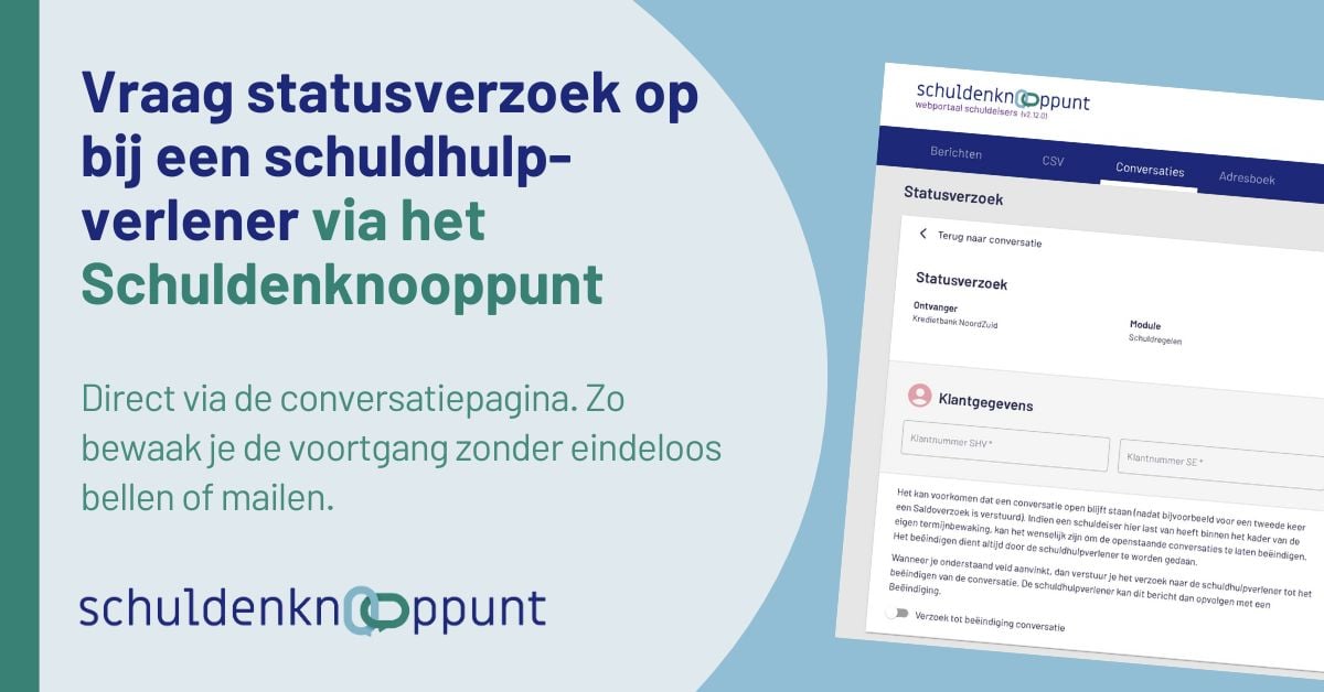 Goed nieuws: je kunt nu zelf een statusupdate opvragen via het Schuldenknooppunt. Ga naar je conversatiepagina, open de betreffende conversatie en klik op 'statusverzoek'. Vul het klantnummer van de schuldhulpverlener in (uit je eigen administratie) en verstuur het verzoek. De schuldhulpverlener ontvangt je verzoek en stuurt direct een statusbericht terug met de actuele stand van zaken. Zo blijf je grip houden op de voortgang zonder eindeloos e-mailen of bellen.