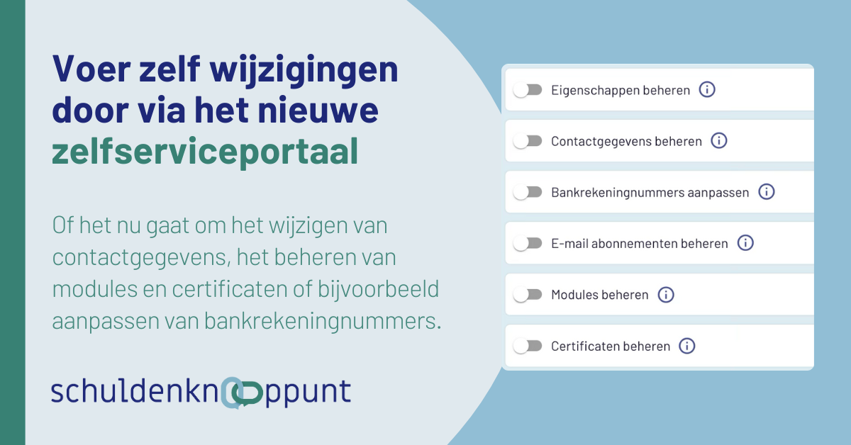 Log in als beheerder (dat kan als je via je eigen e-Herkenningsbeheerder toegang hebt gekregen tot de dienst ‘Schuldenknooppunt Beheer’) en je kunt direct aan de slag. Let op: afhankelijk van het soort wijziging wordt deze direct doorgevoerd, of moet deze goedgekeurd worden door de beheerders van het Schuldenknooppunt.